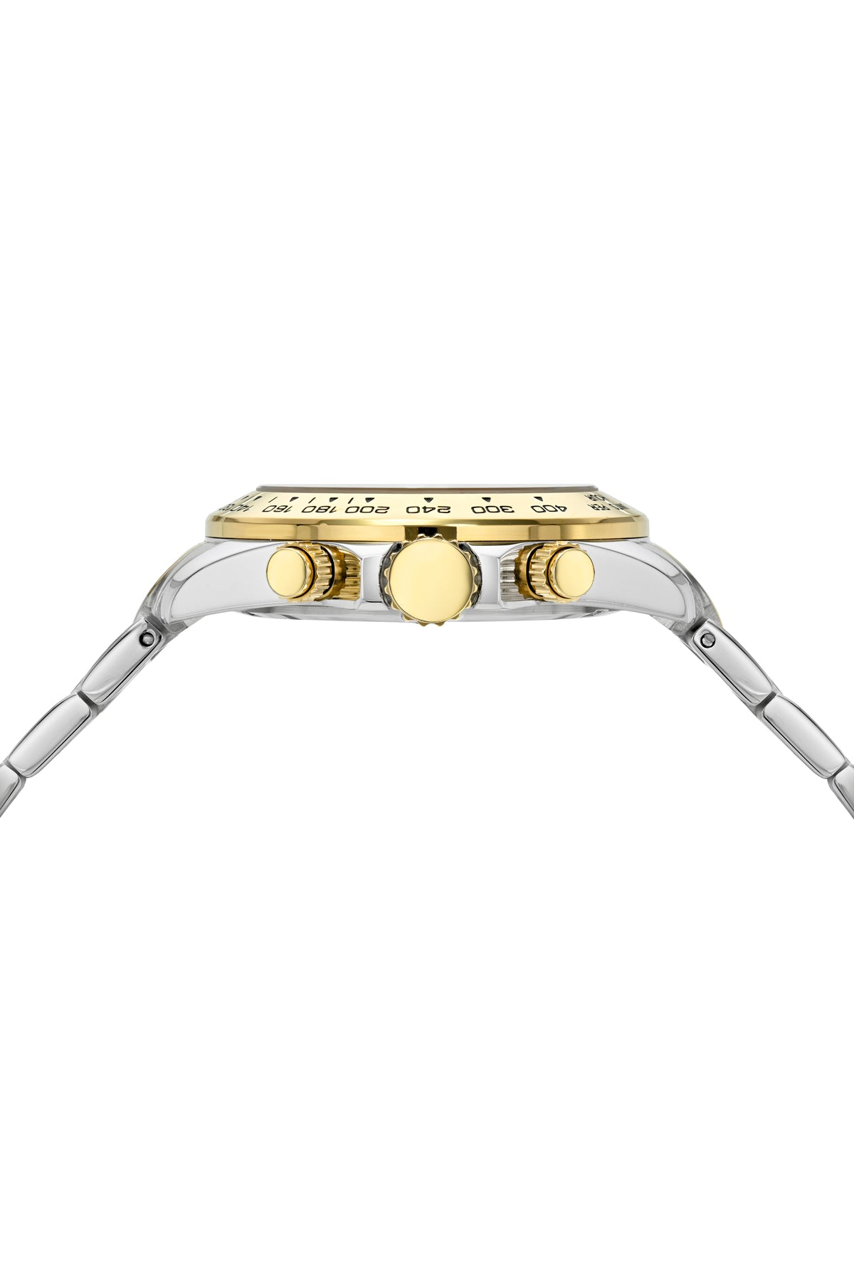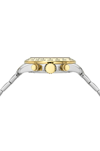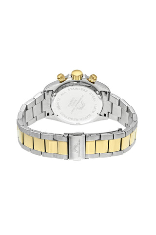 Elegant and modern, the Alexis features a sunray dial in raspberry red, housed in a silver‑tone round stainless steel case. Paired with a silver and gold stainless steel bracelet, protected by a sapphire‑coated crystal, day and date windows keep you on schedule a 24‑hour subdial provides a second time perspective dual time zone display lets you track another city—an elegant treasure for any occasion.