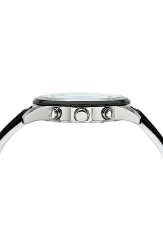 Elegant and modern, the Arthur features a distinctive dial in black with blue subdials, housed in a silver tone round stainless steel case and black bezel. Paired with a black and white silicone strap, protected by a sapphire coated crystal, chronograph subdials track minutes and seconds a date window keeps you on track a dynamic blend of art and engineering.