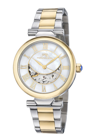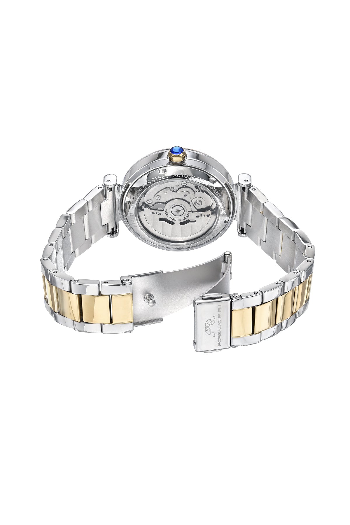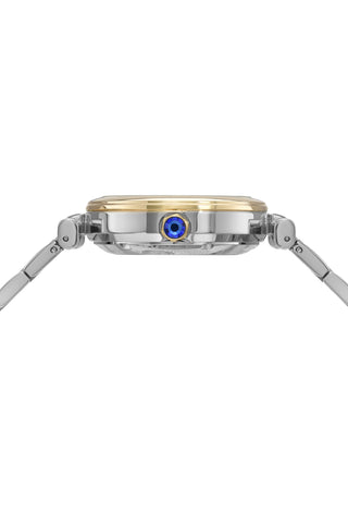 Elegant and refined, the Colette, powered by an automatic movement, features a distinctive open heart and mother of pearl dial with topaz gemstone hour markers. Housed in a gold‑tone round stainless steel case with exhibition case back and paired with a two-tone stainless steel bracelet —a statement for those who appreciate mechanical beauty.