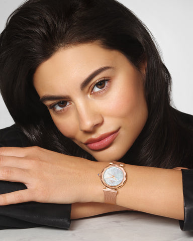 Elegant and graceful, the Hazel features a distinctive dial in white, housed in a rose‑toned round stainless steel case. Paired with a rose stainless steel bracelet, protected by a sapphire‑coated crystal, accented with radiant topaz—a timeless piece that balances style and luxury.