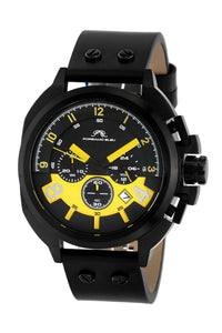 Elegant and polished, the Connor features a distinctive dial in black and yellow, housed in a black‑plated round stainless steel case. Paired with a genuine leather strap, protected by a sapphire‑coated crystal, chronograph subdials track minutes and seconds a date window keeps you on track—a dynamic blend of art and engineering.