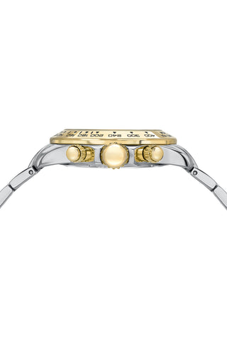 Elegant and modern, the Alexis features a sunray dial in raspberry red, housed in a silver‑tone round stainless steel case. Paired with a silver and gold stainless steel bracelet, protected by a sapphire‑coated crystal, day and date windows keep you on schedule a 24‑hour subdial provides a second time perspective dual time zone display lets you track another city—an elegant treasure for any occasion.