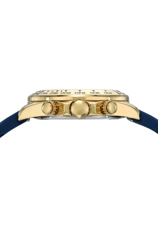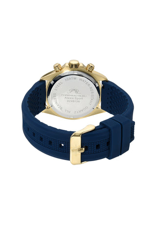 Elegant and modern, the Alexis Sport features a sunray dial in blue, housed in a gold‑tone round stainless steel case. Paired with a blue silicone strap, protected by a sapphire‑coated crystal, day and date windows keep you on schedule a 24‑hour subdial provides a second time perspective dual time zone display lets you track another city—an elegant treasure for any occasion.