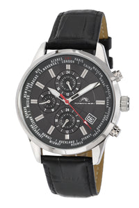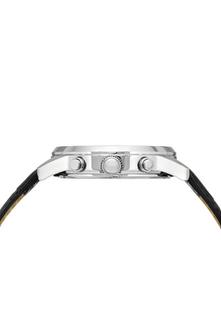 Elegant and modern, the Harrison features a distinctive dial in grey, housed in a silver‑tone round stainless steel case. Paired with a black genuine leather strap, protected by a sapphire‑coated crystal, day and date windows keep you on schedule a 24‑hour subdial provides a second time perspective dual time zone display lets you track another city—an elegant treasure for any occasion.