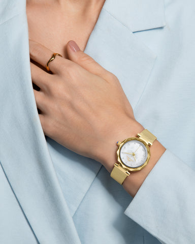 Elegant and graceful, the Hazel features a distinctive dial in white, housed in a gold‑tone round stainless steel case. Paired with a gold stainless steel bracelet, protected by a sapphire‑coated crystal, accented with radiant topaz—a timeless piece that balances style and luxury.