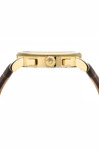 Elegant and modern, the Phileas features a distinctive dial in ivory, housed in a gold‑tone round stainless steel case. Paired with a brown genuine leather strap, protected by a sapphire‑coated crystal, chronograph subdials track minutes and seconds a date window keeps you on track—a dynamic blend of art and engineering.