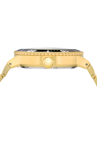 Elegant and bold, the Sebastian features a distinctive dial in gold‑tone with black outer ring, housed in a gold‑tone round stainless steel case. Paired with a stainless steel bracelet, protected by a sapphire‑coated crystal, a date window keeps you on track—an elegant treasure for any occasion.