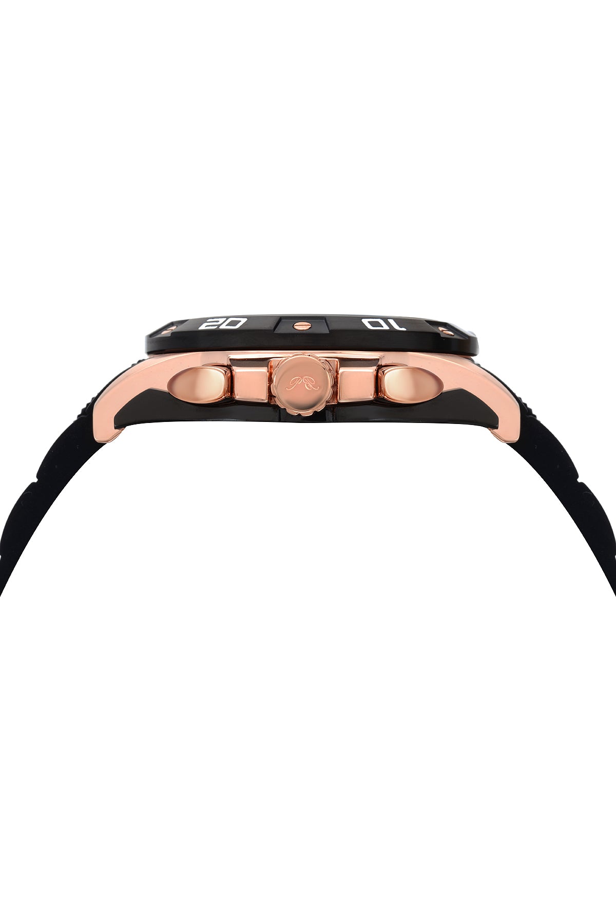 Elegant and bold, the Francoise features a distinctive dial in white with rose‑toned elements, housed in a rose‑toned round stainless steel case. Paired with a silicone strap, protected by a sapphire‑coated crystal, chronograph subdials track minutes and seconds a date window keeps you on track—a dynamic blend of art and engineering.