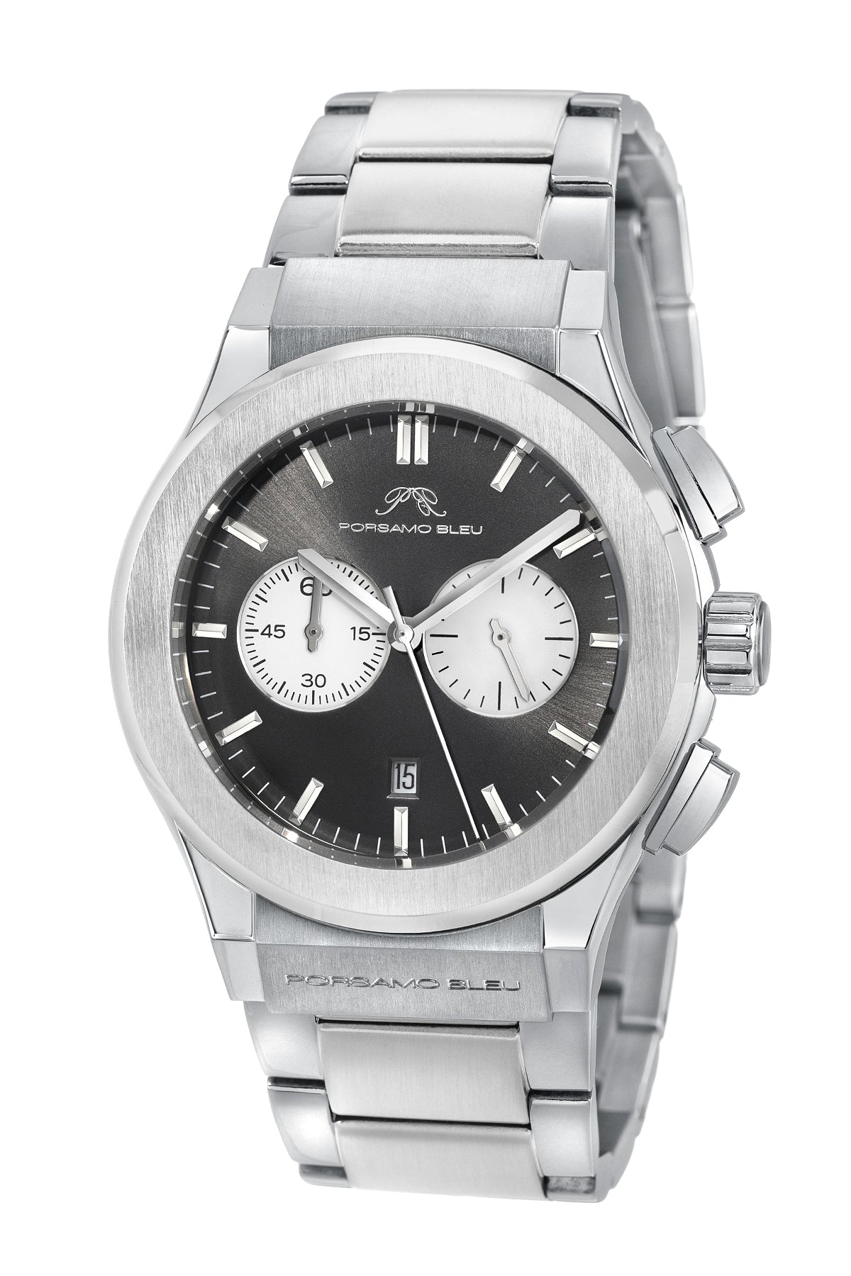Elegant and graceful, the Austin features a sunray dial in grey, housed in a silver‑tone round stainless steel case. Paired with a silver stainless steel bracelet, protected by a sapphire‑coated crystal, chronograph subdials track minutes and seconds a date window keeps you on track—a dynamic blend of art and engineering.
