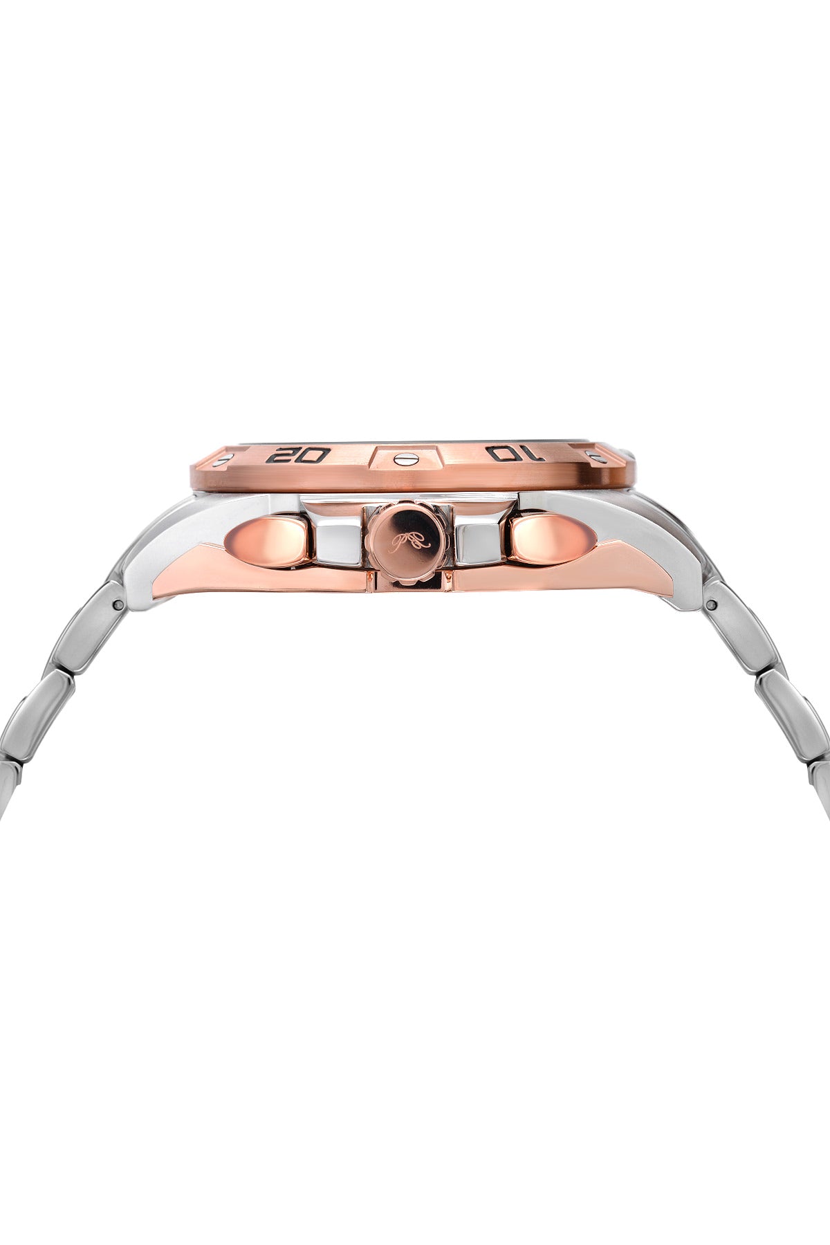 Elegant and bold, the Francoise features a distinctive dial in black with rose‑toned elements, housed in a rose‑toned round stainless steel case. Paired with a stainless steel bracelet, protected by a sapphire‑coated crystal, chronograph subdials track minutes and seconds a date window keeps you on track—a dynamic blend of art and engineering.