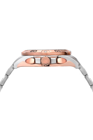 Elegant and bold, the Francoise features a distinctive dial in white with rose‑toned elements, housed in a rose‑toned round stainless steel case. Paired with a stainless steel bracelet, protected by a sapphire‑coated crystal, chronograph subdials track minutes and seconds a date window keeps you on track—a dynamic blend of art and engineering.