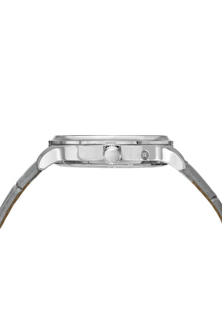 Elegant and striking, the Jonathan features a distinctive dial in grey, housed in a silver‑tone round stainless steel case. Paired with a grey genuine leather strap, protected by a sapphire‑coated crystal, day and date windows keep you on schedule—a classic design with a touch of modern romance.