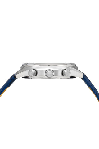 Elegant and refined, the Dylan features a distinctive dial in blue, housed in a silver‑tone round stainless steel case. Paired with a blue genuine leather strap, protected by a sapphire‑coated crystal, day and date windows keep you on schedule a 24‑hour subdial provides a second time perspective dual time zone display lets you track another city—an elegant treasure for any occasion.