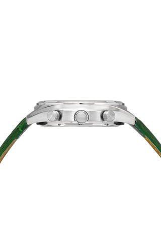 Elegant and refined, the Dylan features a distinctive dial in green, housed in a silver‑tone round stainless steel case. Paired with a green genuine leather strap, protected by a sapphire‑coated crystal, day and date windows keep you on schedule a 24‑hour subdial provides a second time perspective dual time zone display lets you track another city—an elegant treasure for any occasion.