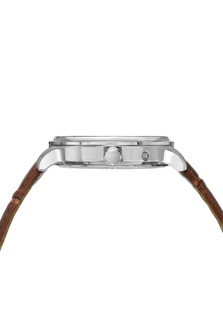 Elegant and striking, the Jonathan features a distinctive dial in silver, housed in a silver‑tone round stainless steel case. Paired with a genuine leather strap, protected by a sapphire‑coated crystal, day and date windows keep you on schedule—a classic design with a touch of modern romance.