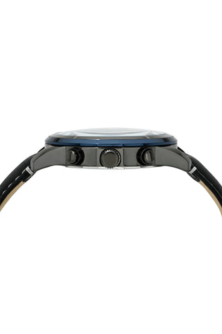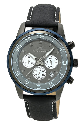 Elegant and modern, the Arthur features a distinctive dial in gunmetal and silver tone, housed in a silver tone round stainless steel case and blue bezel. Paired with a black genuine leather strap, protected by a sapphire coated crystal, chronograph subdials track minutes and seconds a date window keeps you on track a dynamic blend of art and engineering.