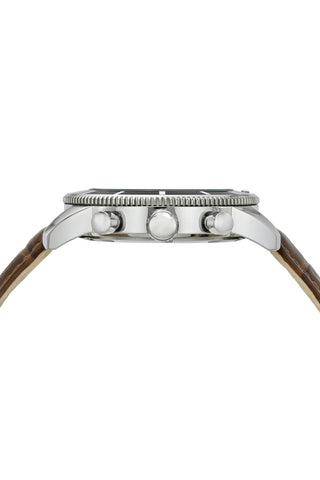 Elegant and graceful, the Brandon features a sunray dial in silver, housed in a silver tone round stainless steel case with black ceramic bezel. Paired with a genuine leather strap, protected by a sapphire?coated crystal, chronograph subdials track minutes and seconds a date window keeps you on track—a dynamic blend of art and engineering.