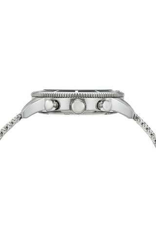 Elegant and graceful, the Brandon features a sunray dial in ice blue, housed in a silver tone round stainless steel case with black ceramic bezel. Paired with a stainless steel bracelet, protected by a sapphire?coated crystal, chronograph subdials track minutes and seconds a date window keeps you on track—a dynamic blend of art and engineering.