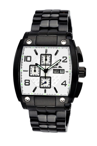 Elegant and bold, the LONDON features a distinctive dial in white with black elements, housed in a black‑plated round stainless steel case. Paired with a stainless steel bracelet, protected by a sapphire‑coated crystal, chronograph subdials track minutes and seconds day and date windows keep you on schedule a 12‑hour counter adds versatility—a dynamic blend of art and engineering.
