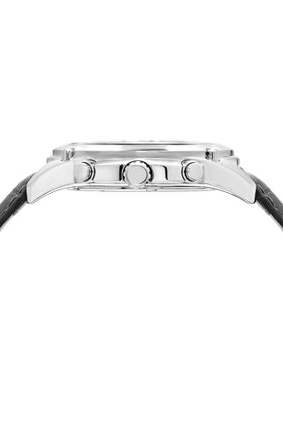 Elegant and bold, the Nathan features a distinctive dial in black, housed in a silver‑tone round stainless steel case. Paired with a genuine leather strap, protected by a sapphire‑coated crystal, chronograph subdials track minutes and seconds a date window keeps you on track—a dynamic blend of art and engineering.