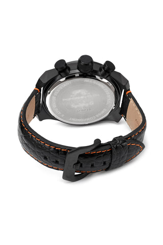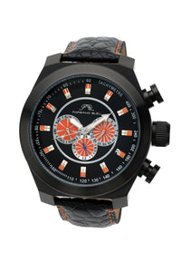 Elegant and striking, the Sydney G features a distinctive dial in black with orange subdials, housed in a black‑plated round stainless steel case. Paired with a genuine leather strap, protected by a sapphire‑coated crystal, day and date windows keep you on schedule a 24‑hour subdial provides a second time perspective—a refined accessory that exudes romance.