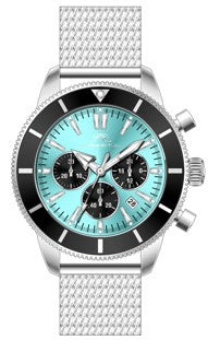 Elegant and graceful, the Brandon features a sunray dial in ice blue, housed in a silver tone round stainless steel case with black ceramic bezel. Paired with a stainless steel bracelet, protected by a sapphire?coated crystal, chronograph subdials track minutes and seconds a date window keeps you on track—a dynamic blend of art and engineering.