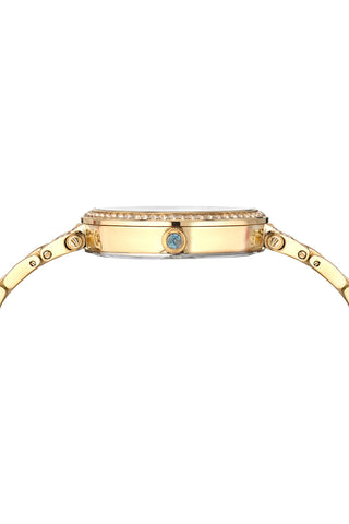 Elegant and striking, the Chantal features a mother‑of‑pearl dial in white, housed in a gold‑tone stainless steel case with genuine topaz gemstones on the bezel, lugs as well as hour markers. Paired with a narrow design, gold-tone stainless bracelet —a timeless piece that balances style and luxury.