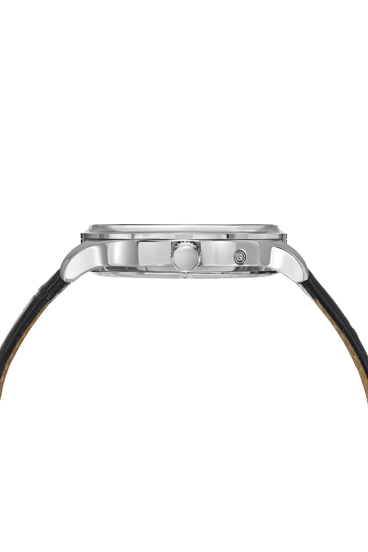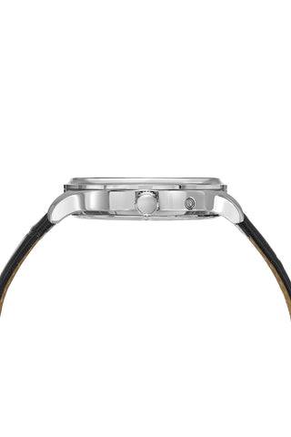 Elegant and striking, the Jonathan features a distinctive dial in black, housed in a silver‑tone round stainless steel case. Paired with a black genuine leather strap, protected by a sapphire‑coated crystal, day and date windows keep you on schedule—a classic design with a touch of modern romance.