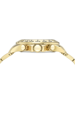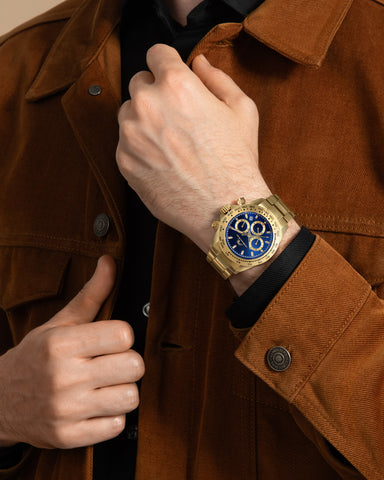 Elegant and striking, the Preston features a sunray dial in blue, housed in a gold‑tone round stainless steel case. Paired with a stainless steel bracelet, protected by a sapphire‑coated crystal, day and date windows keep you on schedule a 24‑hour subdial provides a second time perspective dual time zone display lets you track another city—an elegant treasure for any occasion.