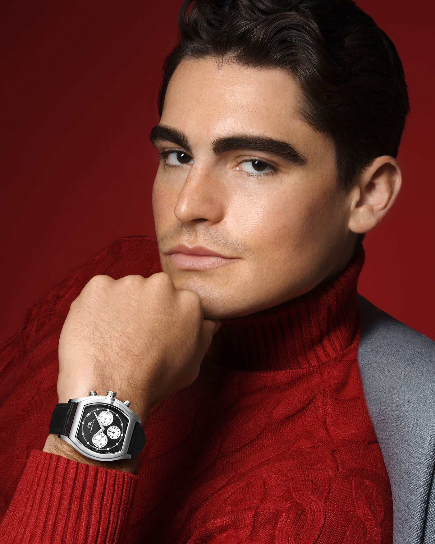 Elegant and sophisticated, the Roman features a distinctive dial in black with silver subdials, housed in a silver‑tone tonneau stainless steel case. Paired with a black genuine leather strap, protected by a sapphire‑coated crystal—a timeless piece that balances style and luxury.