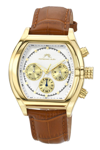 Elegant and sophisticated, the Roman features a distinctive dial in white with gold subdials, housed in a gold‑tone tonneau stainless steel case. Paired with a brown genuine leather strap, protected by a sapphire‑coated crystal—a timeless piece that balances style and luxury.