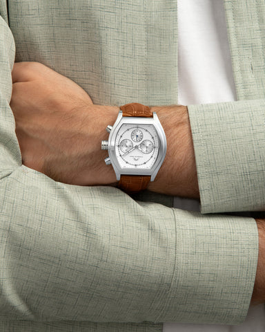 Elegant and sophisticated, the Roman features a distinctive dial in white with silver subdials, housed in a silver‑tone tonneau stainless steel case. Paired with a brown genuine leather strap, protected by a sapphire‑coated crystal—a timeless piece that balances style and luxury.