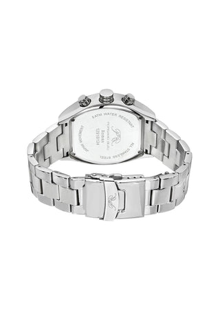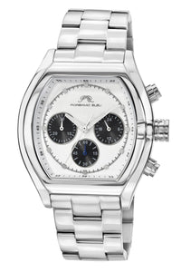 Elegant and sophisticated, the Roman features a distinctive dial in white with black subdials, housed in a silver‑tone tonneau stainless steel case. Paired with a silver stainless steel bracelet, protected by a sapphire‑coated crystal—a timeless piece that balances style and luxury.