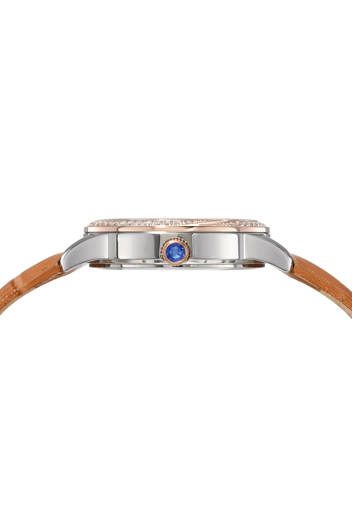 Elegant and bold, the Ruby features a sunray dial in silver, housed in a silver‑tone round stainless steel case. Paired with a brown genuine leather strap, protected by a sapphire‑coated crystal, a date window keeps you on track—an elegant treasure for any occasion.