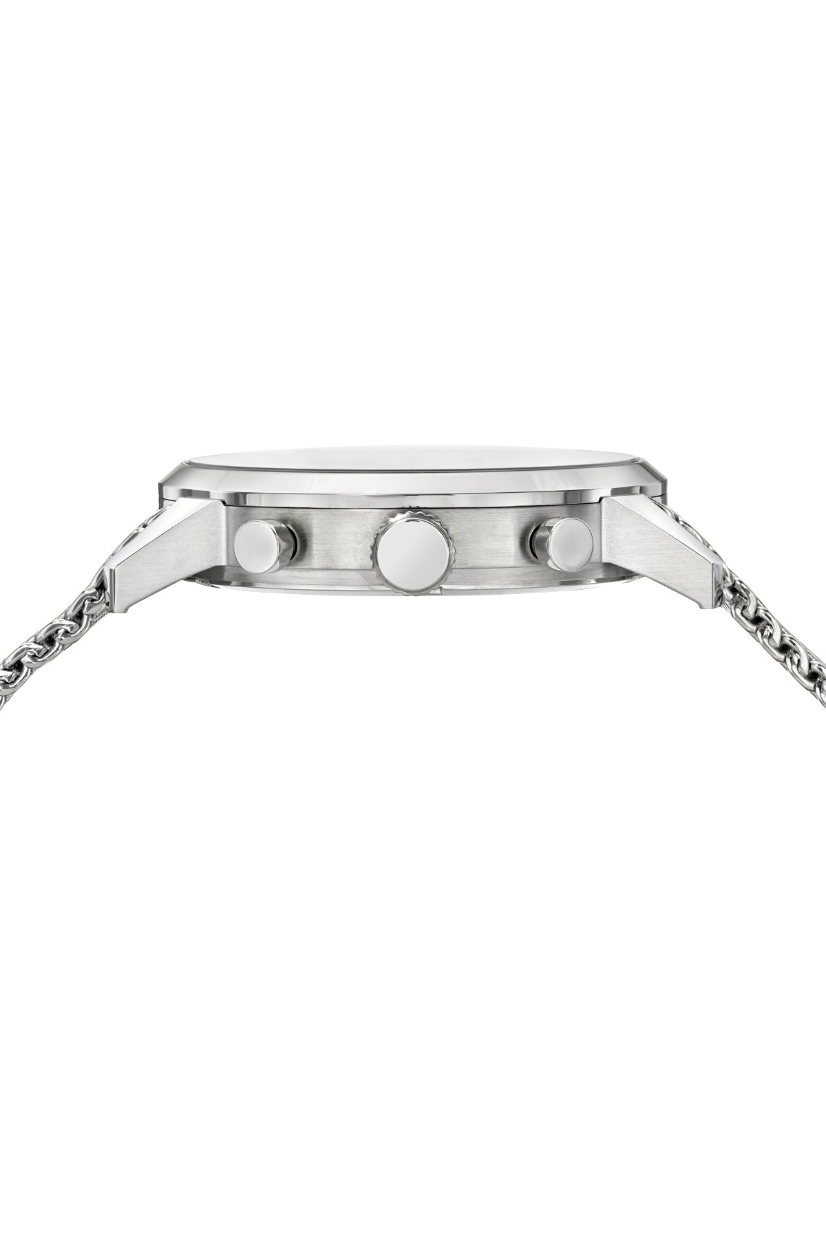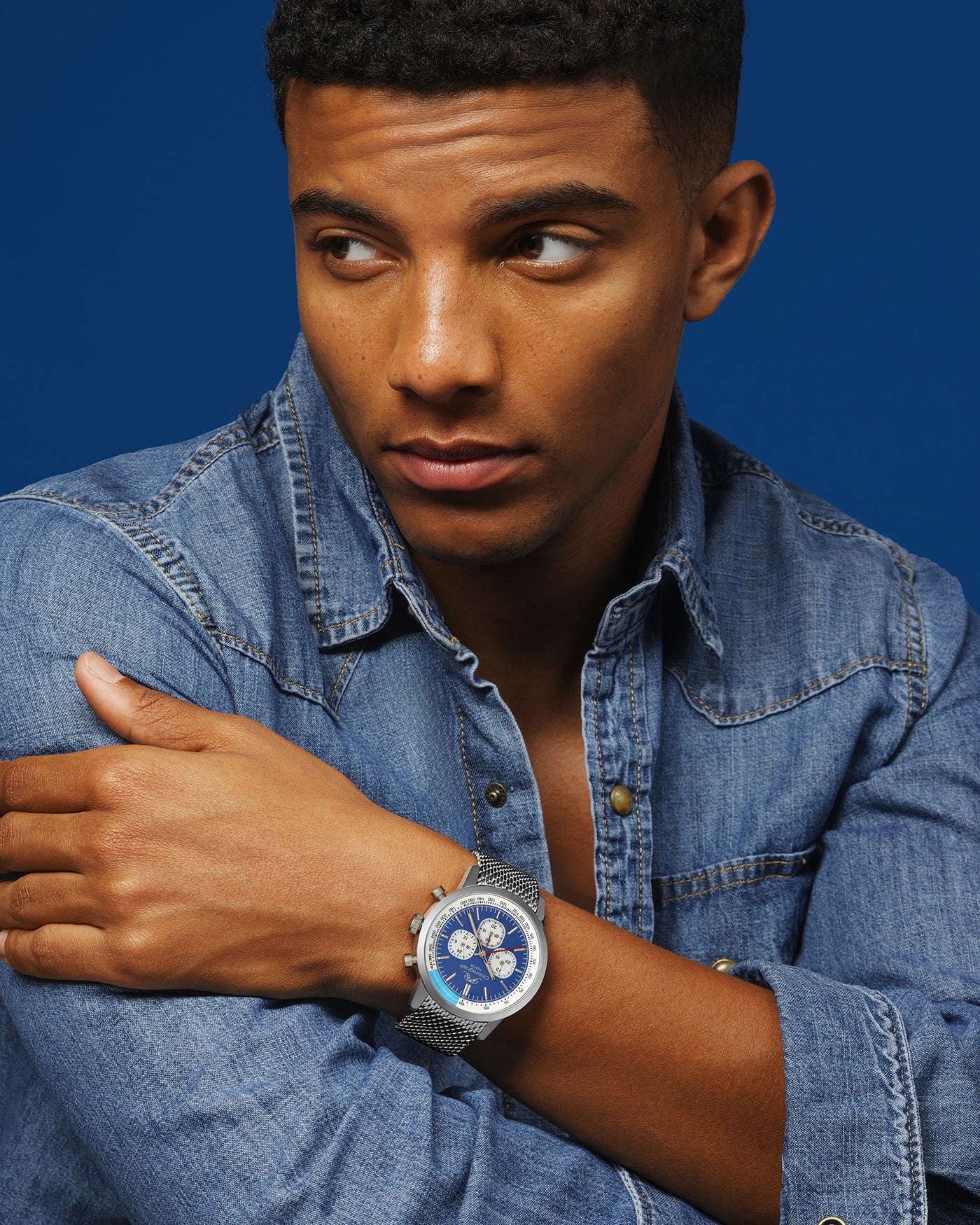 Elegant and modern, the Simon features a distinctive dial in ice blue with silver subdials, housed in a silver‑tone round stainless steel case. Paired with a silver stainless steel bracelet, protected by a sapphire‑coated crystal, chronograph subdials track minutes and seconds a date window keeps you on track—a dynamic blend of art and engineering.