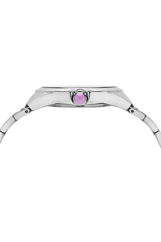Elegant and timeless, the Emilia features a sunray dial in lavender, housed in a silver‑tone round stainless steel case. Paired with a stainless steel bracelet, protected by a sapphire‑coated crystal, accented with sparkling diamonds—a timeless piece that balances style and luxury.