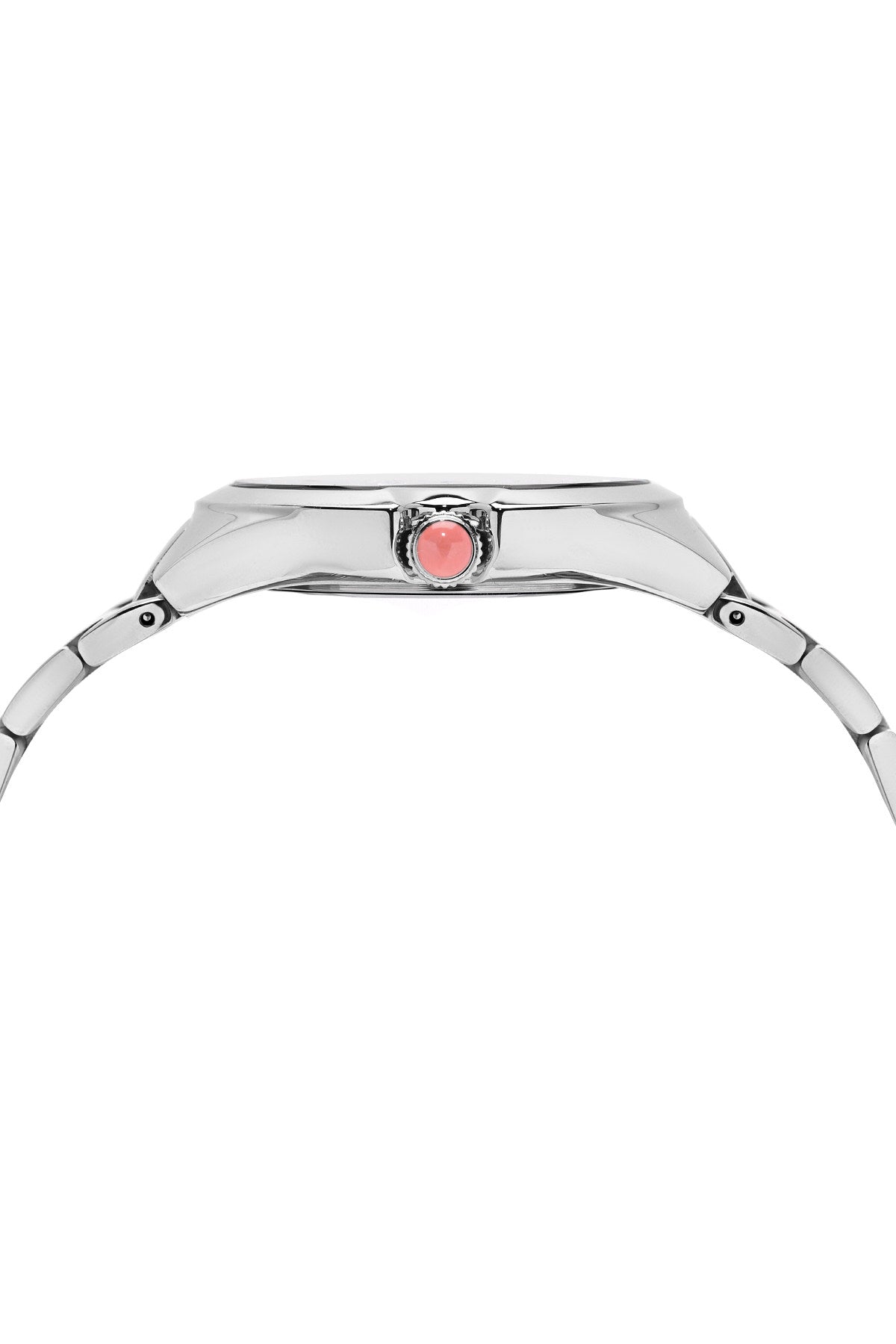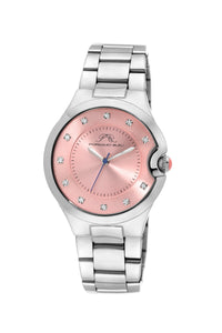 Elegant and timeless, the Emilia features a sunray dial in peach, housed in a silver‑tone round stainless steel case. Paired with a stainless steel bracelet, protected by a sapphire‑coated crystal, accented with sparkling diamonds—a timeless piece that balances style and luxury.