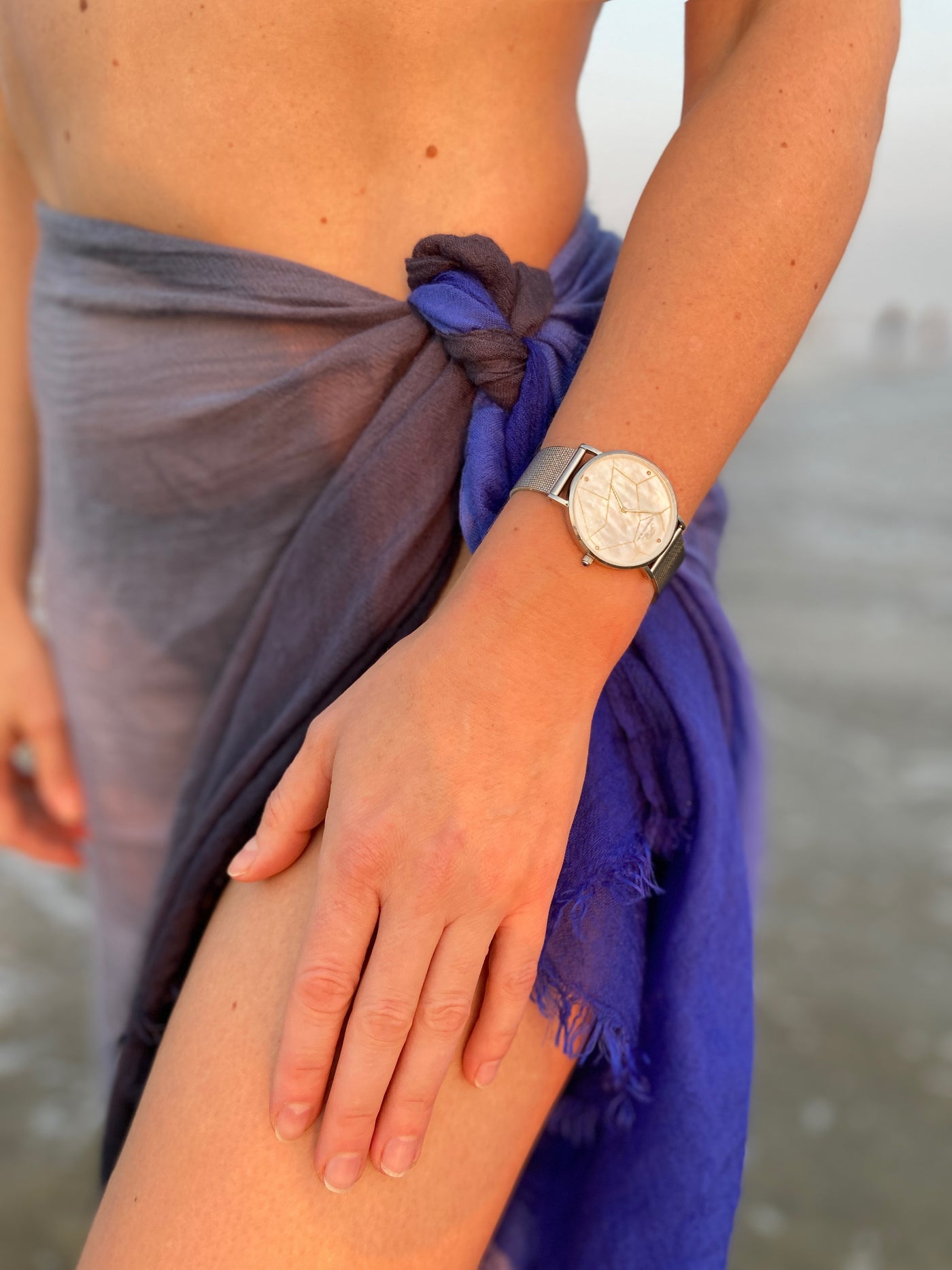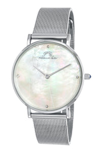 Elegant and bold, the Paloma features a mother‑of‑pearl dial in white, housed in a silver‑tone round stainless steel case. Paired with a mesh bracelet, protected by a sapphire‑coated crystal, accented with sparkling diamonds—a timeless piece that balances style and luxury.