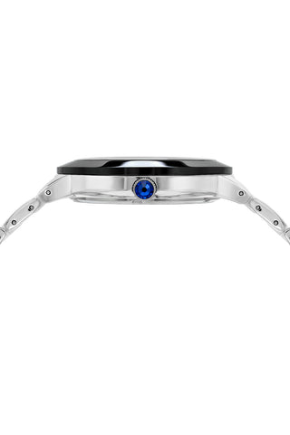 Elegant and bold, the Clarissa features a distinctive dial in black, housed in a silver‑tone round stainless steel case. Paired with a black ceramic strap, protected by a sapphire‑coated crystal—a timeless piece that balances style and luxury.