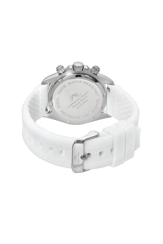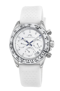Elegant and modern, the Alexis Sport features a distinctive dial in white, housed in a silver‑tone round stainless steel case. Paired with a white silicone strap, protected by a sapphire‑coated crystal, day and date windows keep you on schedule a 24‑hour subdial provides a second time perspective dual time zone display lets you track another city—an elegant treasure for any occasion.