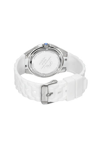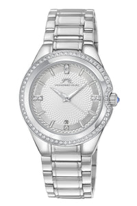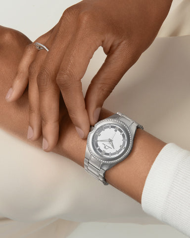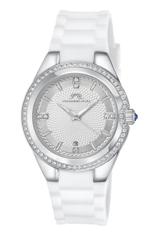 Elegant and striking, the Guilia features a guilloché dial in white, housed in a silver‑tone round stainless steel case. Paired with a silver and white silicone strap, protected by a sapphire‑coated crystal, a date window keeps you on track—an elegant treasure for any occasion.