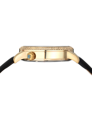 Elegant and striking, the Evelyn features a mother‑of‑pearl dial in black, housed in a gold‑tone round stainless steel case. Paired with a genuine leather strap, protected by a sapphire‑coated crystal, accented with radiant topaz—a timeless piece that balances style and luxury.