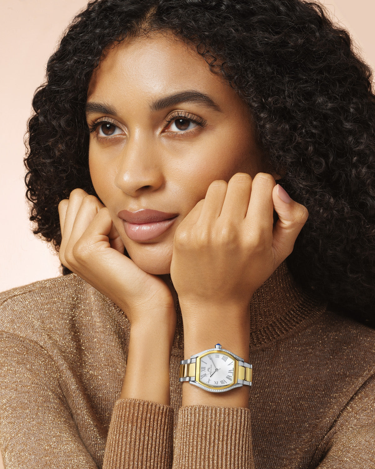Celine women's 33.5 x 40 mm rose tone tonneau crystal watch with stainless steel case & bracelet with foldover buckle