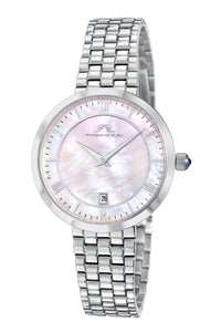 Elegant and striking, the Priscilla features a double‑layered mother‑of‑pearl dial in pink, housed in a silver‑tone round stainless steel case. Paired with a silver stainless steel bracelet, protected by a sapphire‑coated crystal—a timeless piece that balances style and luxury.