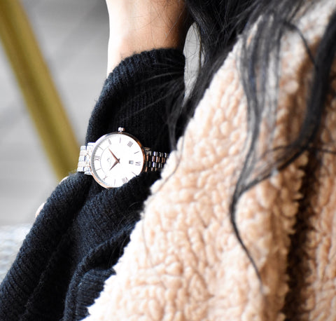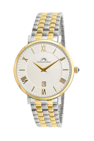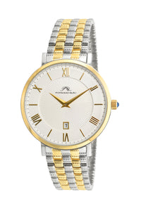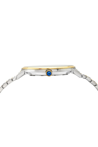 Elegant and bold, the Antonia features a distinctive dial in silver‑tone with gold‑tone elements, housed in a gold‑tone round stainless steel case. Paired with a stainless steel bracelet, protected by a sapphire‑coated crystal, a date window keeps you on track—an elegant treasure for any occasion.