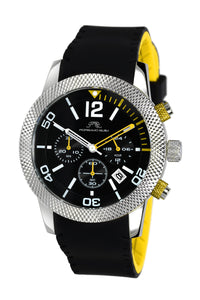 Elegant and sophisticated, the Cameron features a distinctive dial in black with yellow elements, housed in a silver‑tone round stainless steel case. Paired with a silicone strap, protected by a sapphire‑coated crystal, chronograph subdials track minutes and seconds a date window keeps you on track—a dynamic blend of art and engineering.