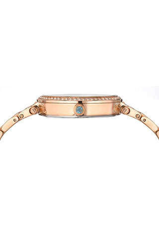 Elegant and striking, the Chantal features a mother‑of‑pearl dial in brown, housed in a rose‑tone stainless steel case with genuine topaz gemstones on the bezel, lugs as well as hour markers. Paired with a narrow design, rose-tone stainless bracelet —a timeless piece that balances style and luxury.