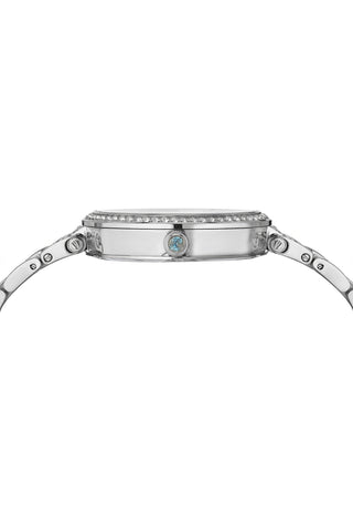 Elegant and striking, the Chantal features a mother‑of‑pearl dial in black, housed in a silver‑tone stainless steel case with genuine topaz gemstones on the bezel, lugs as well as hour markers. Paired with a narrow design, silver-tone stainless bracelet —a timeless piece that balances style and luxury.