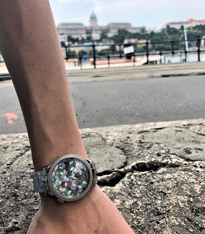 Elegant and striking, the Evelyn features a mother‑of‑pearl dial in black, housed in a silver‑tone round stainless steel case. Paired with a stainless steel bracelet, protected by a sapphire‑coated crystal, accented with radiant topaz—a timeless piece that balances style and luxury.