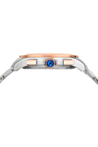 Elegant and bold, the Harper features a distinctive dial in white with rose‑toned elements, housed in a rose‑toned round stainless steel case. Paired with a stainless steel bracelet, protected by a sapphire‑coated crystal, chronograph subdials track minutes and seconds a date window keeps you on track—a dynamic blend of art and engineering.
